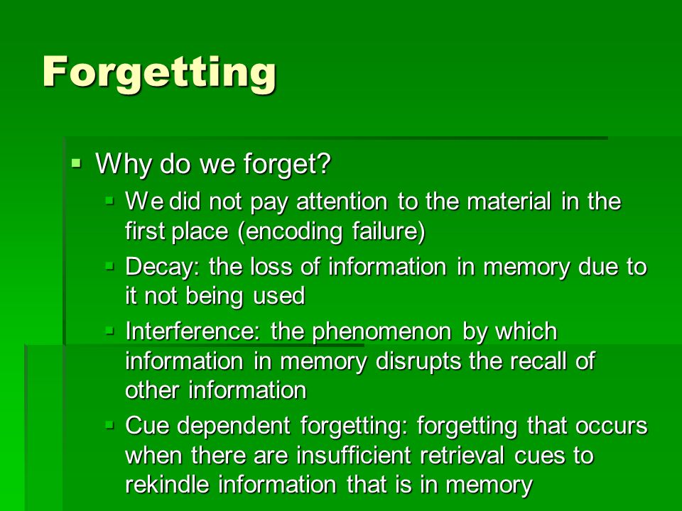 The opposite of the memorising information is obviously forgetting the information that we have gain. Why and how can we forget things?