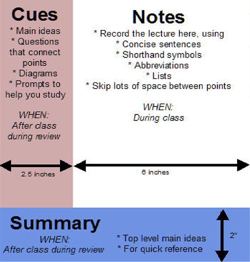 Separate your paper into three sections. The largest section is where you will record information from the lecture using sentences. After the lecture is completed, you will fill out the column to the left of the largest section. This is where you will record the main ideas and anticipate test questions. Finally, at the bottom of the paper, is a summary of the lecture. This should be completed immediately after the lecture because this is when the information will be freshest in your memory.